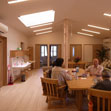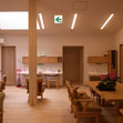 トップライトが効果的で明るい室内となっています。大きな木の柱が木の家を印象づけます。