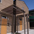 1階に13.5帖のLDK1室と水廻り、2階には十分な収納のある寝室を2室を効率よくまとめたプラン。戸建ての形態なので各室2個以上の窓を確保。前面には2台分の駐車場を配置、玄関前の庇下は自転車を置いたり使い勝手も良い。