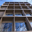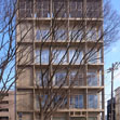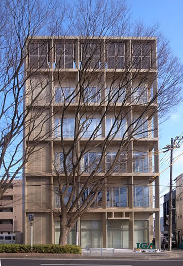 バック施設を収める壁面と3方全面ガラス窓で構成する室内空間の外側に、日常メンテナンスのための外部床とマリオンによるグリッド状のファサードを設け、透明感と影の効果による奥行感のある意匠とした。マリオンを三角形平面とし、細部から全体に至る影の効果とシャープな線の構成を見せることで、当企業に相応しい格式・普遍性をもちつつ、合理的・現代的な建物となることを目指した